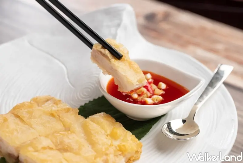 除了冬季溫補湯品和煲仔菜外,張主廚亦大顯身手精心準備他拿手特色菜餚,像是「酥炸百花雞」,其靈感來自名菜江南百花雞,首先將半隻文昌雞去骨、保留雞皮並片成薄片備用,接著以自製手打的新鮮蝦漿混和雞肉丁、荸薺丁包覆雞肉,再裹上脆漿粉後入鍋油炸至金黃香酥,起鍋切塊使成。品嚐時搭配酸甜醬享用,酥脆外皮內有雞肉的滑嫩與蝦肉的鮮甜,多層次的口感,讓人停不下來。