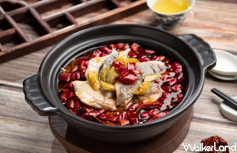 另一道「水煮鯧魚球」則以香辣滋味烘托白鯧的厚實鮮美,為食客以麻辣暖身並促進食慾。首先將鯧魚保留魚皮、去骨片成魚塊後,以滾水川燙煮熟,另取油鍋以小火將花椒、辣椒煸出香氣,之後於砂鍋中放入川燙過的金針菇、雲耳及銀芽豐富口感,再鋪覆鯧魚球並淋上醬汁,再添加少許燈籠泡椒為醬汁增添些微酸度,魚肉的嫩滑和香辣爽口的迷人滋味,讓人一口接一口。