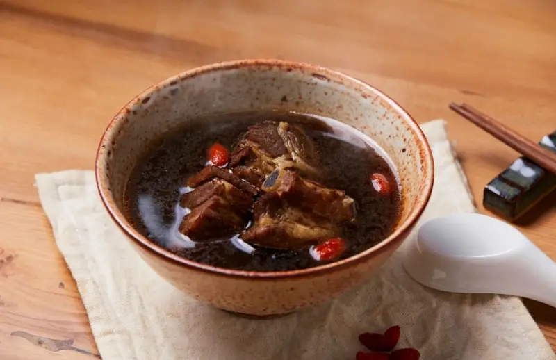 ▲藥燉排骨湯將當歸、川芎、熟地、黨蔘、桂枝、茯苓、黃耆、杜仲、甘草、白芍、肉桂、枸杞、黑棗等中藥材精心熬煮。