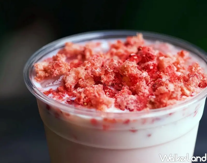 而「草苺脆脆鮮乳」選用冬日季節熟甜度恰到好處的草莓,熬煮製成草莓果漿,結合鮮醇鮮乳,最後上層再灑上滿滿草莓碎粒,刺激味蕾且增添口感,甜美的粉色系飲品,一改原本冷調質感的黑白灰色系,多了一點粉紅泡泡、多一點幸福的感覺。