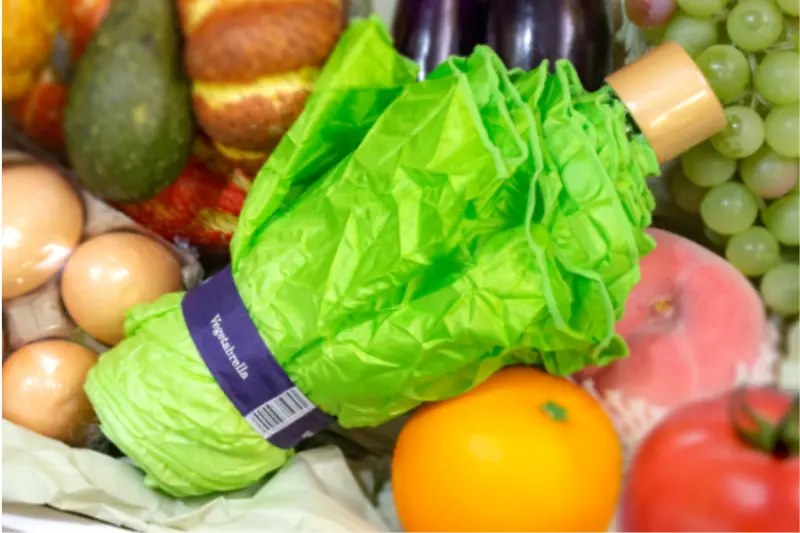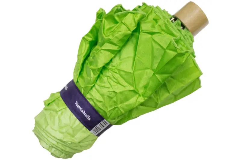 在日本網路造成話題的「萵苣折傘」,因為外觀實在和一般的食用生菜太過相似,「Tokyo Noble」還表示這個產品在自家所有長傘、折疊傘當中,是唯一會引起眾人會心一笑的創意商品,而這把萵苣折傘特別設計了皺褶,所以整把捆起來之後,就和超市販售的蔬菜看起來完全沒兩樣,若在下雨天用過之後再收起來,上面殘留的水滴會讓這把假生菜看起來「更新鮮」呢。
