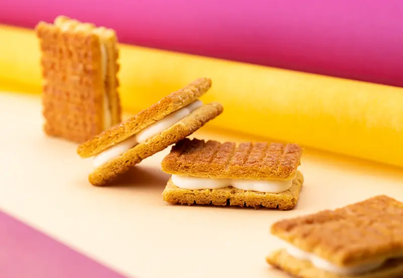 拿近一看,就能看到一顆顆顯眼易見的砂糖顆粒,緊密附著在類似派皮的酥脆餅乾上方,不會輕易脫落,但天氣太熱的話可能會導致融化,所以Sugar Butter Sand Tree的夾心餅乾建議是在常溫的狀態下食用,才能享受到最佳狀態的美味。