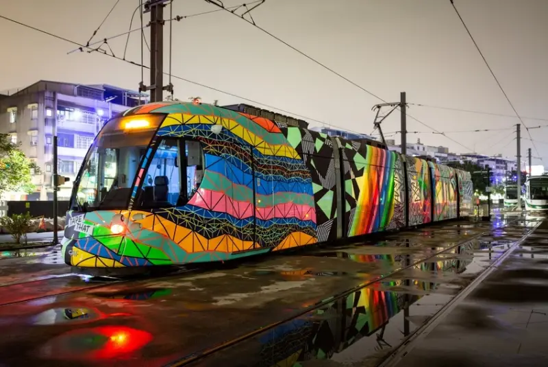 高雄輕軌列車變身移動式花燈!以膠帶藝術聞名國際的德國柏林團隊TAPE THAT,運用特殊的螢光膠膜搭配蓄光膠帶,為高雄輕軌列車勾勒發光輪廓,成為台灣燈會中唯一的移動式花燈。(瘋設計fundesign.tv提供)