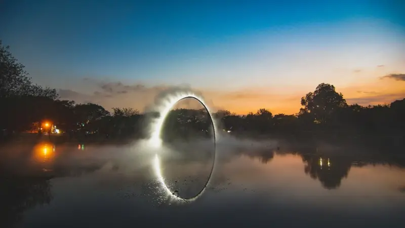 衛武營北湖的「Arc Zero Eclipse 弧 零:月食」將藝術作品置於湖面之上,在夜裡如火光般發亮的圓形霧環與湖面融合,以簡單的水、光、空氣元素營造出深刻的美感,還有「湖映森光」作品將自然植物與燈光巧妙融合,將高雄的自然景觀成為美麗花燈作品的一部分,絕美景色值得一看。