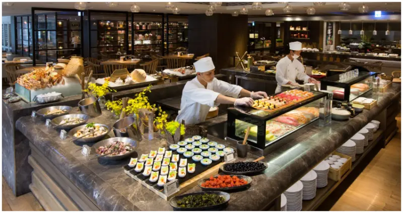 廚藝團隊精湛手藝,在開放式廚房下一覽無遺!每日直送的新鮮海產與頂級食材,呈現近百道自助和風美饌,必嚐的新鮮生魚片、季節烤魚與炙燒海鮮,鮮活呈現日本料理精髓。