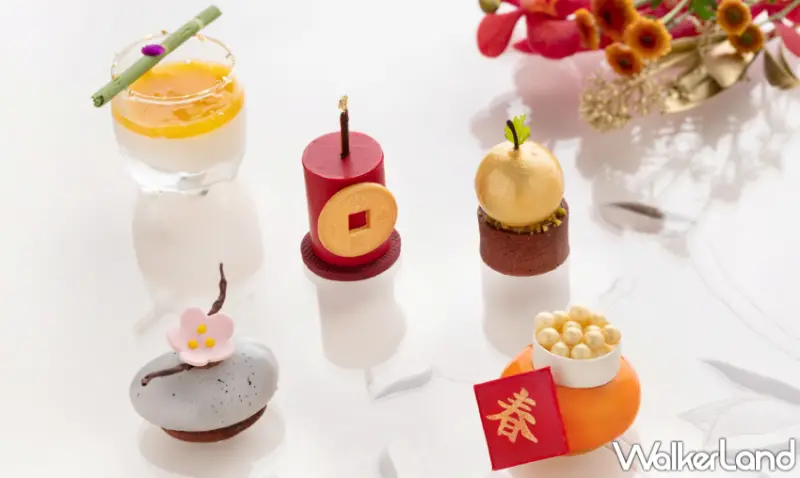 其中,「鞭炮 - 巧克力甘納許蛋糕佐黑金剛花生奶油」,主廚在巧克力海綿蛋糕上舖覆70%黑巧克力甘納許,並搭配以黑金剛花生製成滑順香濃的花生奶油霜,濃郁堅果香氣誘人可口,讓人幸福感油然而生。而「金蘋果 - 金桔奶油威士忌蘋果塔」,主廚在可愛小巧的金蘋果造型,裏頭為帶有淡淡威士忌酒香的香甜蘋果慕斯,搭配底下金桔奶油霜和開心果碎點綴的酥脆塔皮,層次豐富充滿驚喜。