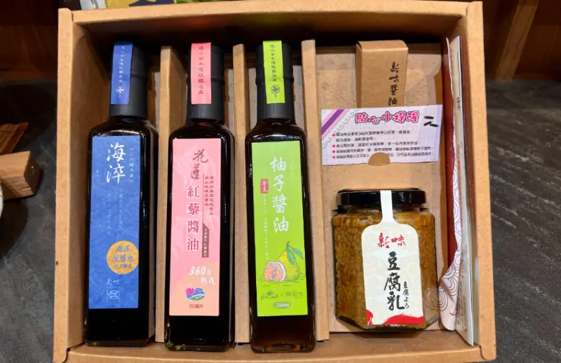 一問之下才知道,新味醬油是花蓮僅存的日式傳統釀造醬油工廠,也是許多東台灣老字號餐廳御用的手工醬油店,如德利豆乾、液香扁食、戴記扁食、花蓮香扁食、炸彈蔥油餅、南華大陸麵店、周家小籠包蒸餃(這家才是老花蓮吃的公正街包子);或許是愈聊愈起勁,許媽媽把兒子也就是第三代傳人許桓巽喚了出來,跟我分享許先生近期推出「洄瀾禮盒」的理念。![]()