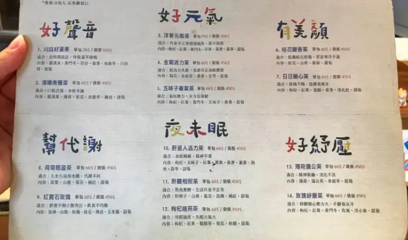 手艸生活經營六年,老闆Hugo的爺爺經營漢方藥材行,爸爸是中藥師,自身也投入餐飲領域,秉持醫食同源的理念,將傳統中藥湯的養生知識作為基石,著手改良,加入花草茶、香草茶、生活茶概念,翻新人們對於中藥是藥的刻板印象,以此推出「好聲音、好元氣、有美顏、幫代謝、夜未眠、好舒壓」等系列生活茶款,每款皆是複方調配,喝起來順口、清甜、芳香,性溫和,可每日當保健茶飲用。![]()