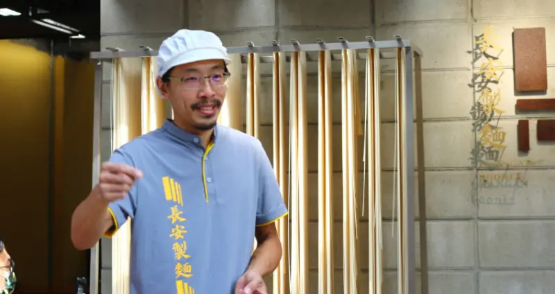 除了職人手技,更重要的是自然條件,屏東市緊鄰高屏溪,每當西南季風起風時,大武山跟高屏溪產生對流,讓屏東市的溫、溼度,成為最適合製麵的場域;許多台灣乾拌麵的大型企業至此參訪取經,想要知道手工日曬掛麵的秘訣是什麼?吳冠翬說:技術、人力、水粉比例都能人為控制,只有天氣不行,而屏東風土就是長安製麵歷久不衰的秘訣。![]()