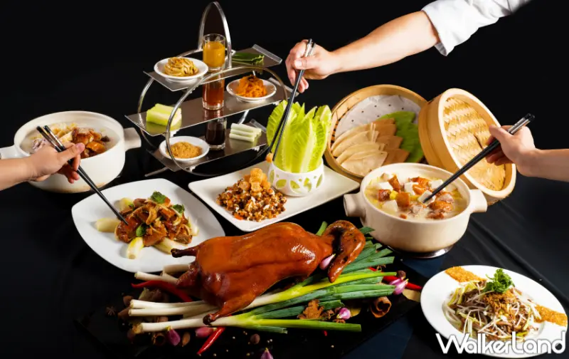其中,第一吃「片皮鴨」,用菠菜馬告、紅蘿蔔刺蔥及全麥老麵等三色餅皮,佐以招牌甜麵醬、金蒜燒鴨醬、蜂蜜金桔醬,還有花生粉跳跳糖、桂花情人果、哈密瓜等多種配料,同時吃到經典及創意風味。
