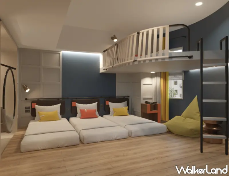 而在飯店房型配置部分,提供有兩單人床與一大床的雙人客房,以及四個單人床與兩大床的四人客房,其中配有四個單人床的歡樂四人房內,設計有小隔樓以及超吸睛的月亮造型躺椅,搭配上房內的繽紛配色更是超好拍。
