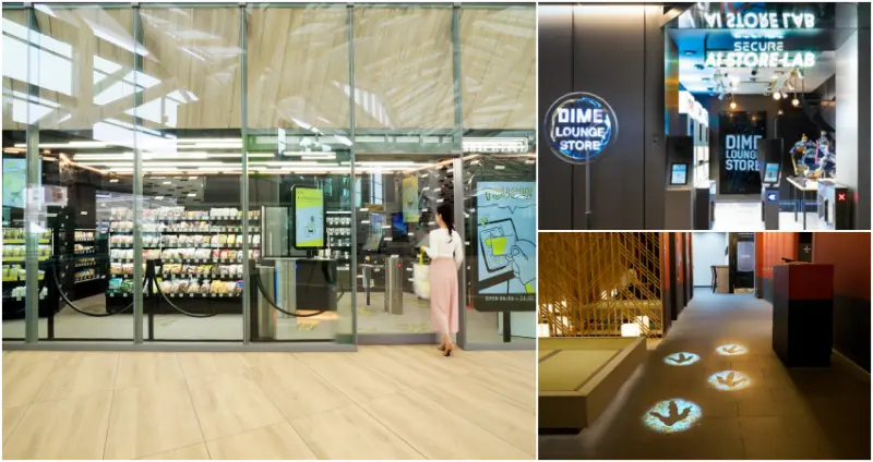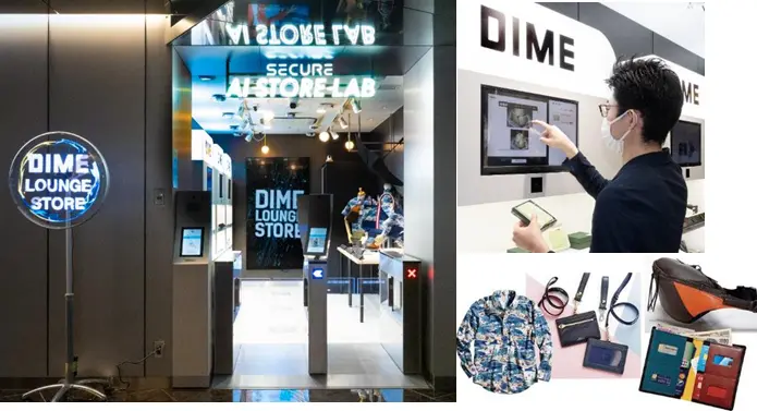 DIME LOUNGE STORE以「可享受近未來的購物體驗」的概念所完成,消費者在入口處登錄完個人與信用卡資訊,進行臉部辨識即可入店消費。架上拿取商品時,商品詳情與賣點會顯示在眼前螢幕上,讓消費者在沒有店員介紹商品狀況下,也能迅速掌握商品特性。結帳時也非常便利,拿著心儀商品往出口處移動,進行臉部辨識,無須掃描商品條碼即能火速完成結帳。