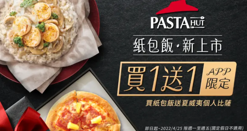 想吃美味不用等,現在就立刻衝一波Pasta Hut嚐鮮!用必勝客PK雙饗卡APP,還可以享有「買一送一」的超級好康- 買紙包飯就送一個夏威夷個人比薩!滿足度大破表,期間限定!活動只到4/25,快來嚐鮮吧!