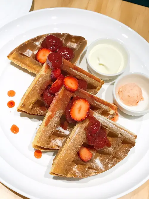 法式吐司口味邊邊帶著點恰恰的脆度,不甜不膩甜度剛剛好,另外還搭配了新鮮草莓以及藍莓,楓糖漿沒有加太多,個人不愛那種偏濕軟的法式吐司口感,這家的法式吐司完全合胃口。<全文介紹>