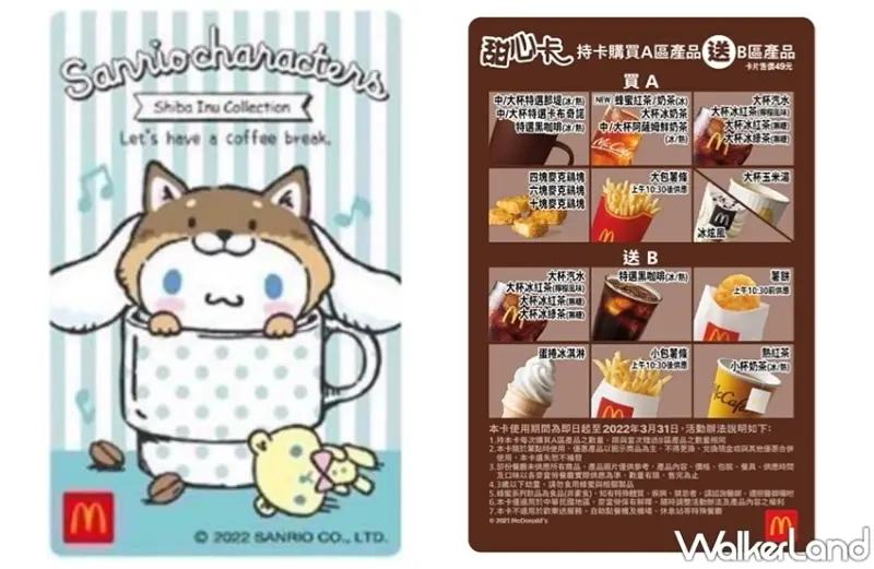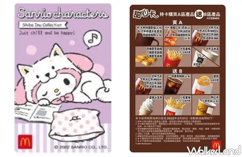 麥當勞鐵粉等不及了!麥當勞2022甜心卡搶先在社群論壇PTT公開,一張堪稱小質族必備、上班族一定有的「麥當勞甜心卡」這一次預計將在三月底與「Kitty、美樂蒂、布丁狗、大耳狗」攜手合作推出「柴柴系甜心卡」,讓粉絲2022年繼續「買A區、送B區」吃起來。![]()