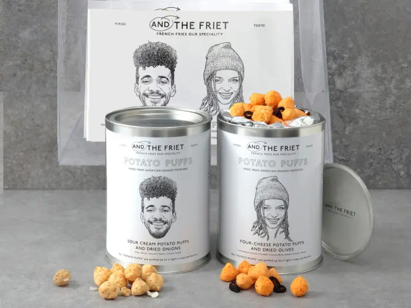 這次AND THE FRIET共推出了兩種口味的馬鈴薯泡芙,一款是「酸奶油&乾燥洋蔥」,另一款則是「四種起司&乾燥橄欖」。四種起司分別是(卡芒貝爾起司、切達起司、豪達起司、藍紋起司),含稅之後售價分別都是1100日圓,平易近人的價錢與豐富的用料,將成為不少人往後到日本旅遊時的伴手禮新選擇。