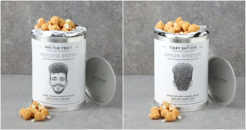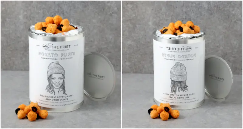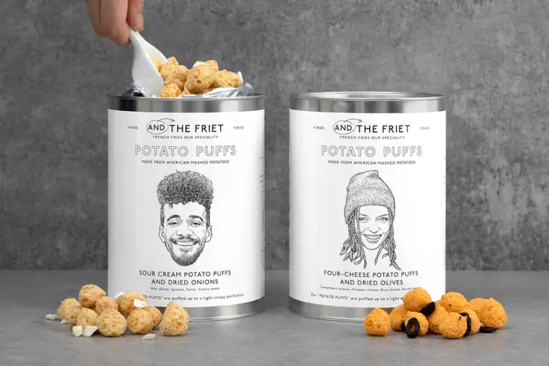 AND THE FRIET的泡芙使用了來自美國的馬鈴薯,帶有鹹味的馬鈴薯香氣和鬆脆的質地,並在裡頭添加了橄欖和洋蔥提味,令人忍不住一口接著一口。除此之外,和之前販售的薯條餅乾包裝一樣,馬鈴薯泡芙的罐子也由國外插畫家Anje Jager所操刀,繪製了一對夫婦的素描插圖,一人分別代表一種口味,吃完之後還能繼續將具有文青風格的油漆罐包裝留下來收藏或使用。