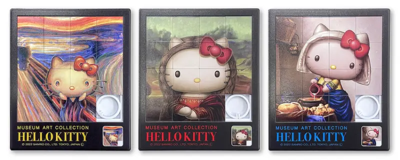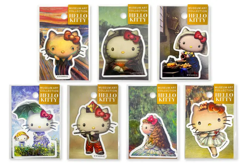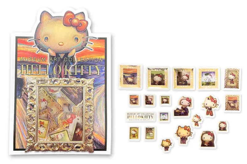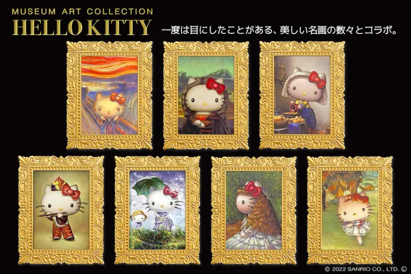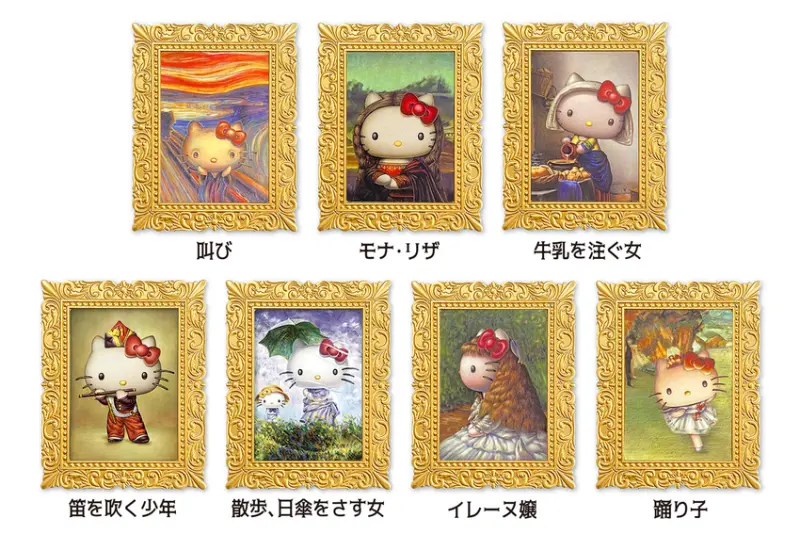 這次Hello Kitty走進的畫作除了孟克的《吶喊》之外,還有達文西《蒙娜麗莎的微笑》、維梅爾《倒牛奶的女僕》、馬奈《吹笛子的少年》、莫內《打陽傘的女人》、雷諾瓦《康達維斯小姐像》、竇加《謝幕》共7幅作品,分別推出6種不同的周邊類型,包含幻燈片拼圖、立體方型拼圖、畫框磁鐵、貼紙與刮畫。