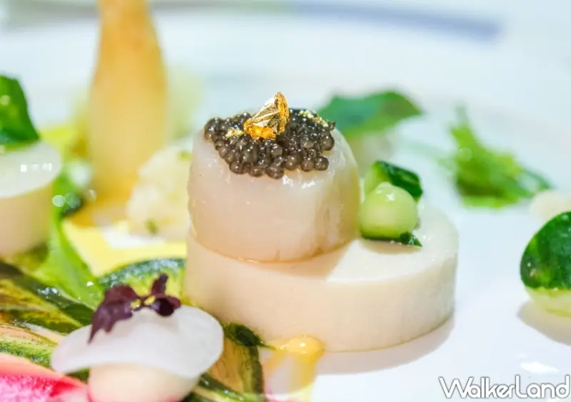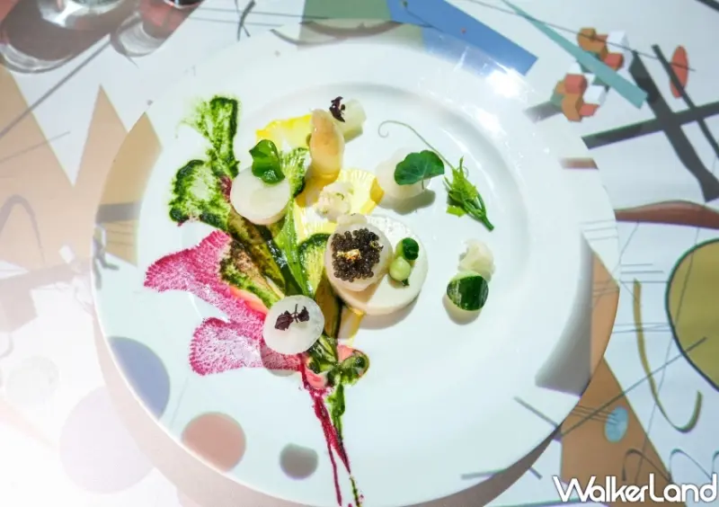 最後以抽象藝術名家「康丁斯基」為發想,用甜菜根、水田芥、番紅花做成天然佐醬,將盤子當作畫布畫出海芋的模樣,北海道生食級干貝、頂級伊朗魚子醬、松露白花椰菜凍和新鮮白蘆筍等食材擺盤,呈現花園的錯覺感。