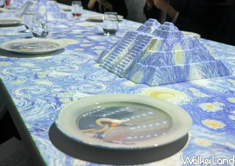 第二道上菜之前先欣賞小廚師的「藝術饗宴」,講述偉大廚師不只要有廚藝,從生活中、藝術中找尋美感和靈感也很重要。整個桌面瞬息萬變,有梵谷星夜、畢卡索、達利、康丁斯基等大師的畫作不斷在桌面上展現,讓人目不轉睛。