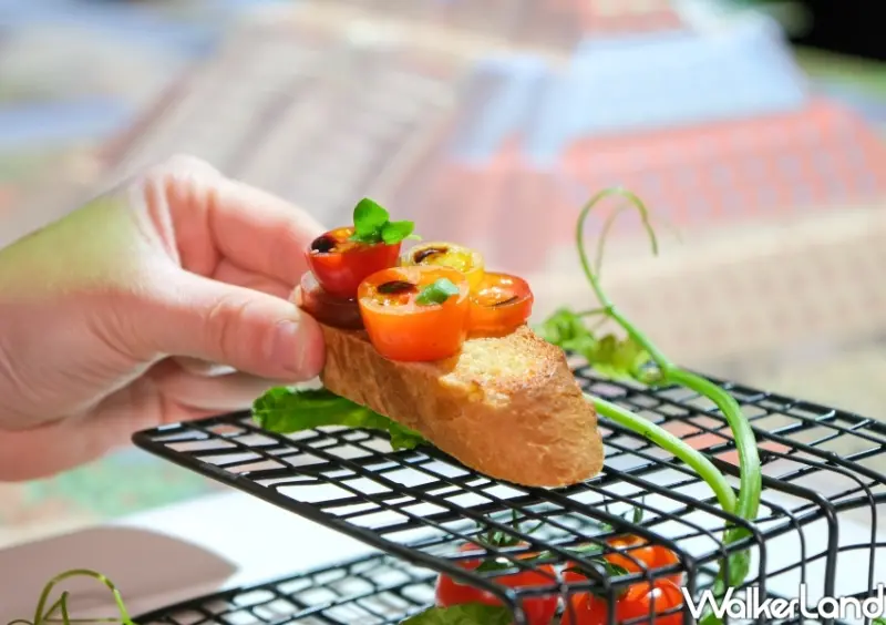 第一道菜以「探索食材淵源 番茄尋味」為主題,將番茄的歷史從祕魯船到歐陸地區、19世紀創造第一個「瑪格莉特比薩」在到法國人口中的「愛的蘋果」等透過動畫一一呈現,最後再端上開胃菜,超夠味的法式蒜味奶油乳酪酸裸麥麵包,配上台灣小農櫻桃番茄,並佐以頂級海鹽、義式紅酒醋提味,是道視覺樸實無華、實則濃郁的開胃菜。