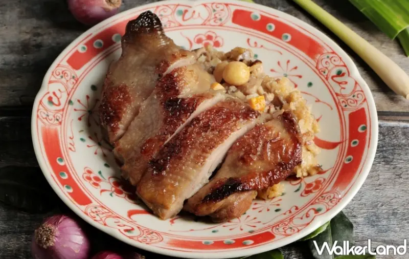 而「斑蘭香茅糯米雞」主廚為傳統廣式經典糯米雞,注入南洋新意。放山古早雞腿以香茅、魚露、紅蔥頭等天然香料醃製一晚入味,再烤至金黃上色。以主廚獨家香料油炒香雞肝、雞胗、香菇,拌入斑蘭葉香茅椰奶醬,與蓮子、鹹蛋黃、豆薯與糯米翻炒蒸熟,再以金華火腿增添鹹香層次,整體風味豐富又平衡,讓傳統廣式糯米雞洋溢南洋風情。