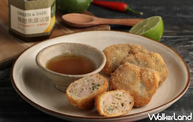 還有「檸檬葉黃金蝦餅」這與米其林一星餐廳LONGTAIL的招牌料理--鮮蝦堡的配方相同,不同的是用上了GREEN&SAFE受歡迎的生態蝦仁現打蝦漿,並加入檸檬葉、香茅、椰奶、魚露調味等豐富南洋香料元素,讓香氣更上層樓,滋味鮮香、酥脆彈牙。