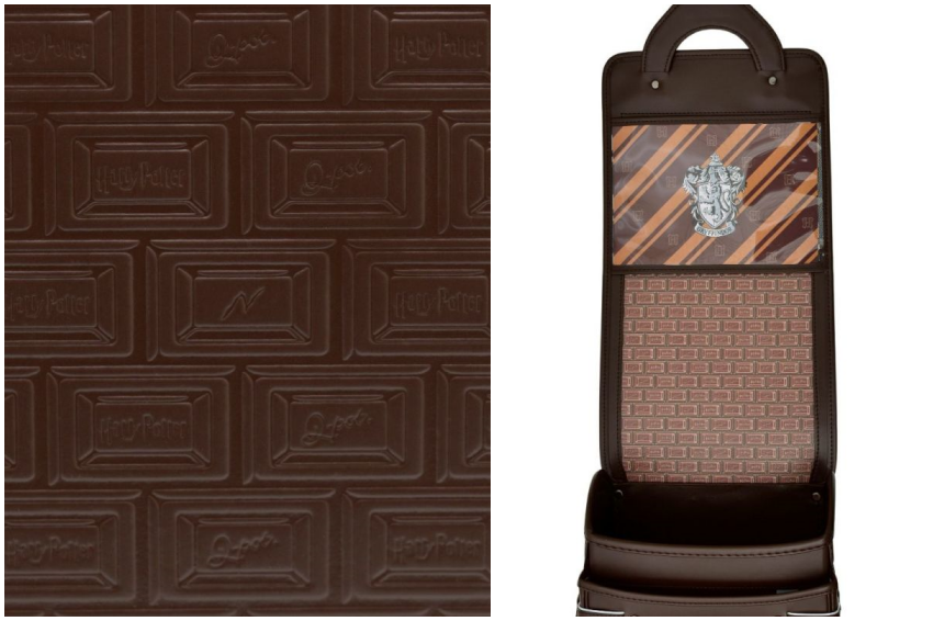 近距離看,會發現這款書包的外表設計是一塊塊印著「Harry Potter」和「Q-pot.」字樣的巧克力磚,打開書包後,內裡則是同樣印著「Harry Potter」和「Q-pot.」圖案的織物,而課程表的部分則有印著史萊哲林、葛來芬多、雷文克勞、赫夫帕夫這四個學院徽章的卡片,做為底圖替換。![]()