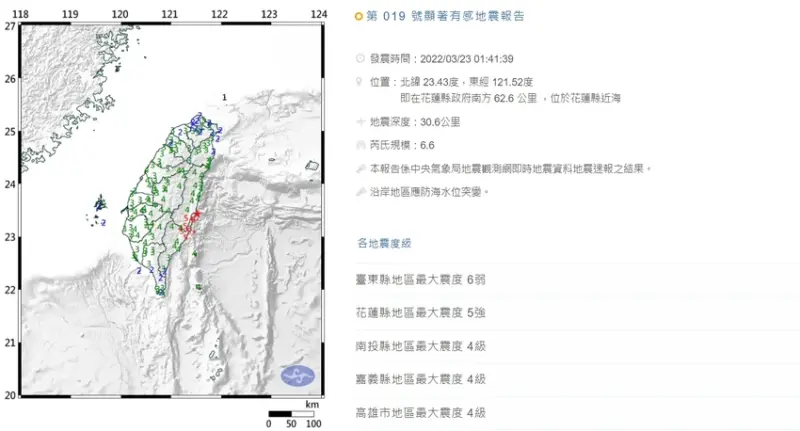 編號019。 規模6.6,深度30.6公里 花蓮縣政府南方62.6公里(位於花蓮縣近海)
