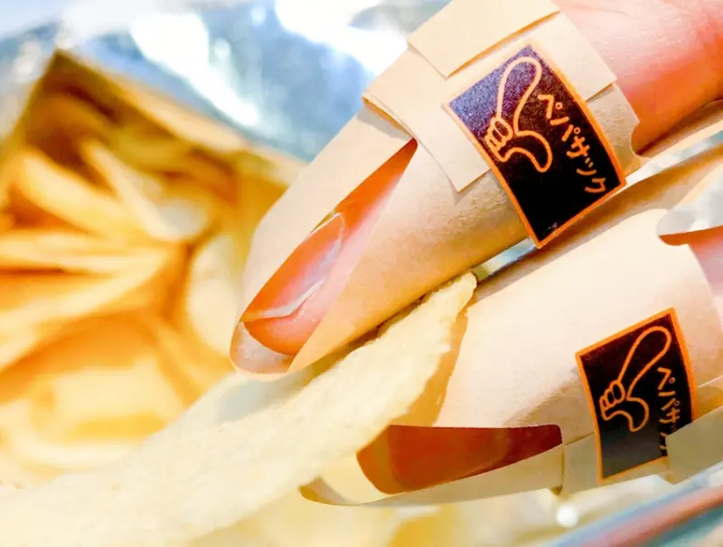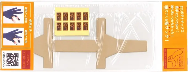 「洋芋片專用指套」可根據手指粗細來調整寬度,而且為了攜帶輕巧、穿脫方便,用的是紙類而非橡膠類材質,更具有防油效果,因此除了不讓餅乾碎屑殘留之外,也不必擔心吃完後需花太多時間清洗手部。