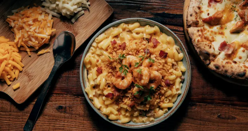 黃金加州產地的優質莫札瑞拉乳酪為通心粉增添濃厚與牽絲的誘人口感;紅切達乳酪的熟成起司香氣則使味道更加飽滿;寇比傑克乳酪則提供溫和甘甜、充滿層次的柔軟後韻,再搭配上酥脆炸蝦、香菇丁以及通心麵,完整構築彷彿香水一般的前、中、後香調堆疊,每一口咀嚼的每分、每秒都是超享受的起司美味!更棒的是,主廚說為了滿足忠誠粉絲們的口福,其逸仙分店和慶城分店均有推出此道餐點喔!