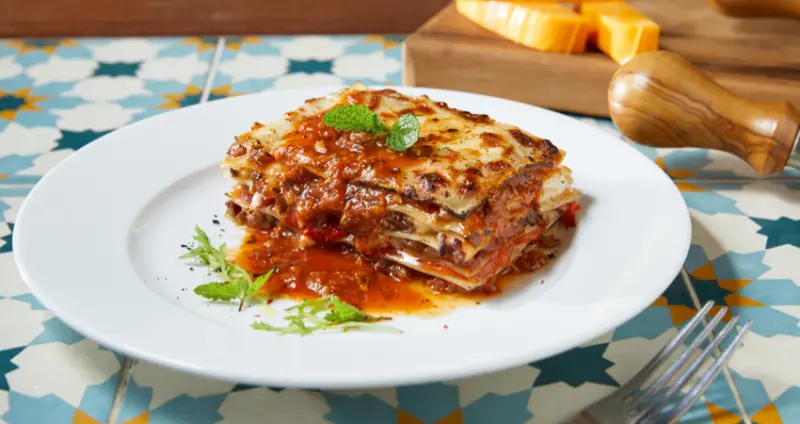 千層麵中最精華的起司部分,是以加州蒙特利傑克乳酪為基底,混合加州莫札瑞拉乳酪,堆疊出多層次的香氣,吃下一口千層麵,就能同時享受到蒙特利傑克乳酪厚實的奶香以及莫札瑞拉乳酪牽絲的效果,兩者之間彼此融合搭配的感受更是讓人徹底欲罷不能!