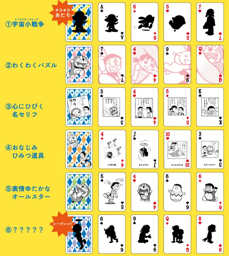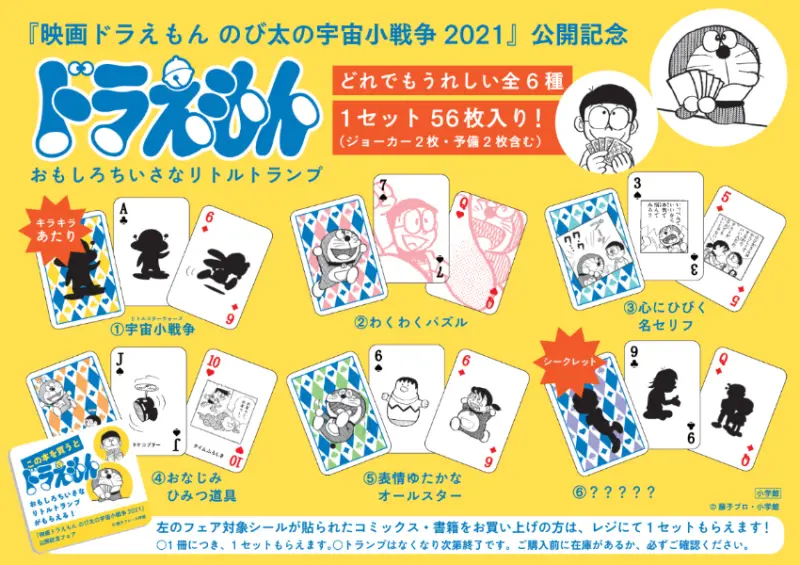 隨著新版電影的上映,業者更是超前部屬,搶先在日本各大書店推出紀念活動,只要到參與活動企劃的書店購買指定的漫畫、書籍,就能獲得哆啦A夢 趣味迷你撲克牌(ドラえもん おもしろちいさなリトルトランプ),共有6種樣式。只要購買一本就能獲得一套撲克牌組,買6本就能全收了。![]()