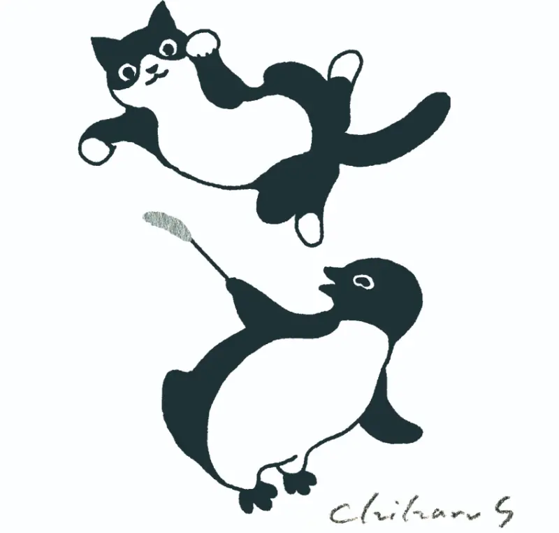 本次個展的主題名為「企鵝百態V 企鵝與貓咪」。為什麼是貓咪呢?因為坂崎千春本身就是一名貓奴,貓因此時常出現在他的筆下。本次個展預計展出100件以上的手稿,企鵝和愉快的夥伴們也將以未公開新作的方式登場。現場也有提供版畫的販售。比如上方手牽手的貓咪和企鵝就是其中一項商品,尺寸約9×9公分,價格49,500日幣。拿著逗貓棒和貓咪玩的企鵝尺寸和價格也都一樣是9×9公分和49,500日幣。![]()