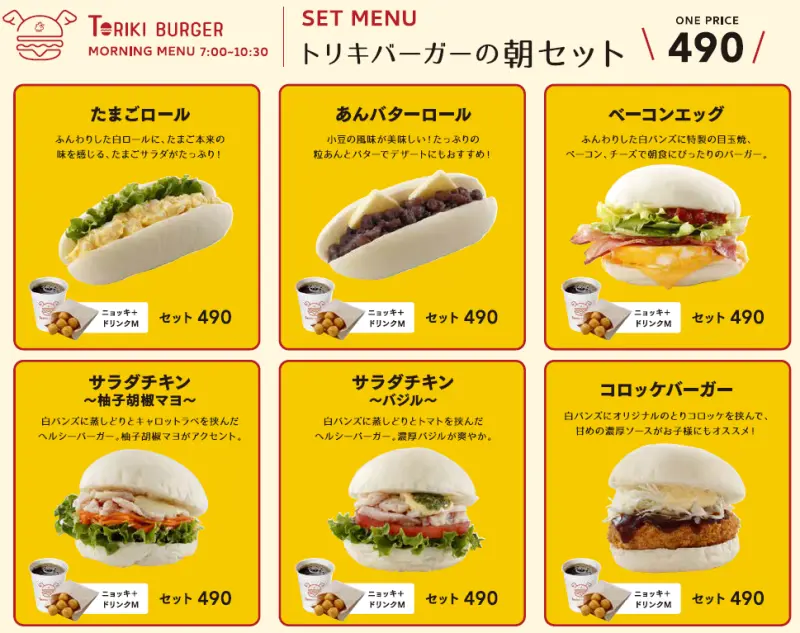 標榜從雞肉、蔬菜到製作漢堡麵包所使用的小麥全都是百分之百源自日本國產食材,鳥貴族在進軍速食業界之後仍舊堅持使用在地原料,而原本居酒屋以全菜單日幣280元均一價的實惠低價累積了不少回頭客,如今開設「TORIKI BURGER鳥貴族漢堡」也將延續這樣的品牌精神,早餐與全天候兩時段的餐點,一律為「漢堡、副餐、飲料」的套餐組合,前者統一為日幣490元、後者價格則是日幣590元,不僅價格同樣平易近人,且變化不大不易使消費者感到混亂。![]()