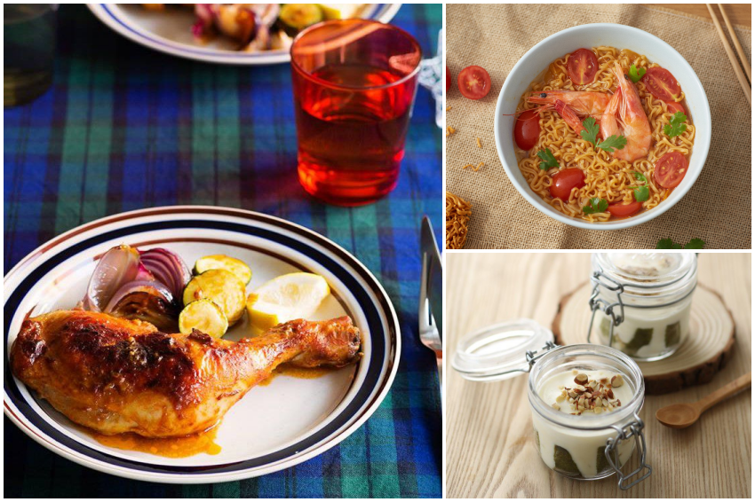 ▲MUJI無印良品的「體驗服務顧問」在官網上分享各式食譜,可在家中完成奶油咖哩烤雞(左)、泰式番茄酸辣鮮蝦麵(右上)、棉花糖奶油乳酪抹茶蛋糕罐(右下)。