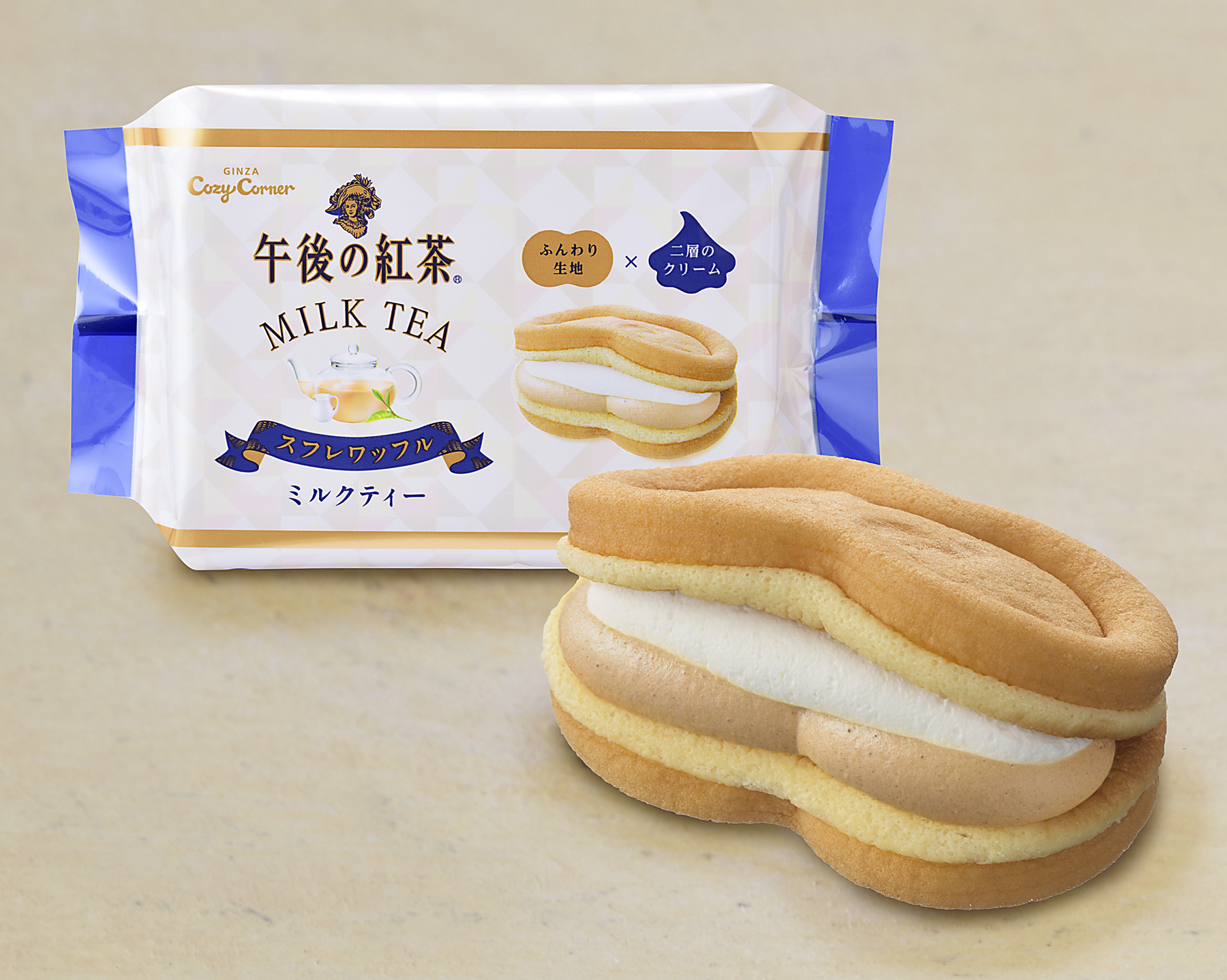 這次的合作甜點以「午後紅茶 奶茶風味」為主題,選用了銀座 Cozy Corner的人氣「舒芙蕾鬆餅(スフレワッフル)」與午後紅茶結合,以口感溫潤的舒芙蕾鬆餅為基底,中間夾入紅茶葉粉末、紅茶粉及香醇的煉乳奶油,將紅茶的苦澀與煉乳的香甜完美融合,再現「午後紅茶 奶茶風味」!綿密的鬆餅與雙層餡料共譜甜蜜滋味,每一口都能嚐到濃厚的奶香,適合在午茶時光慢慢享用!
