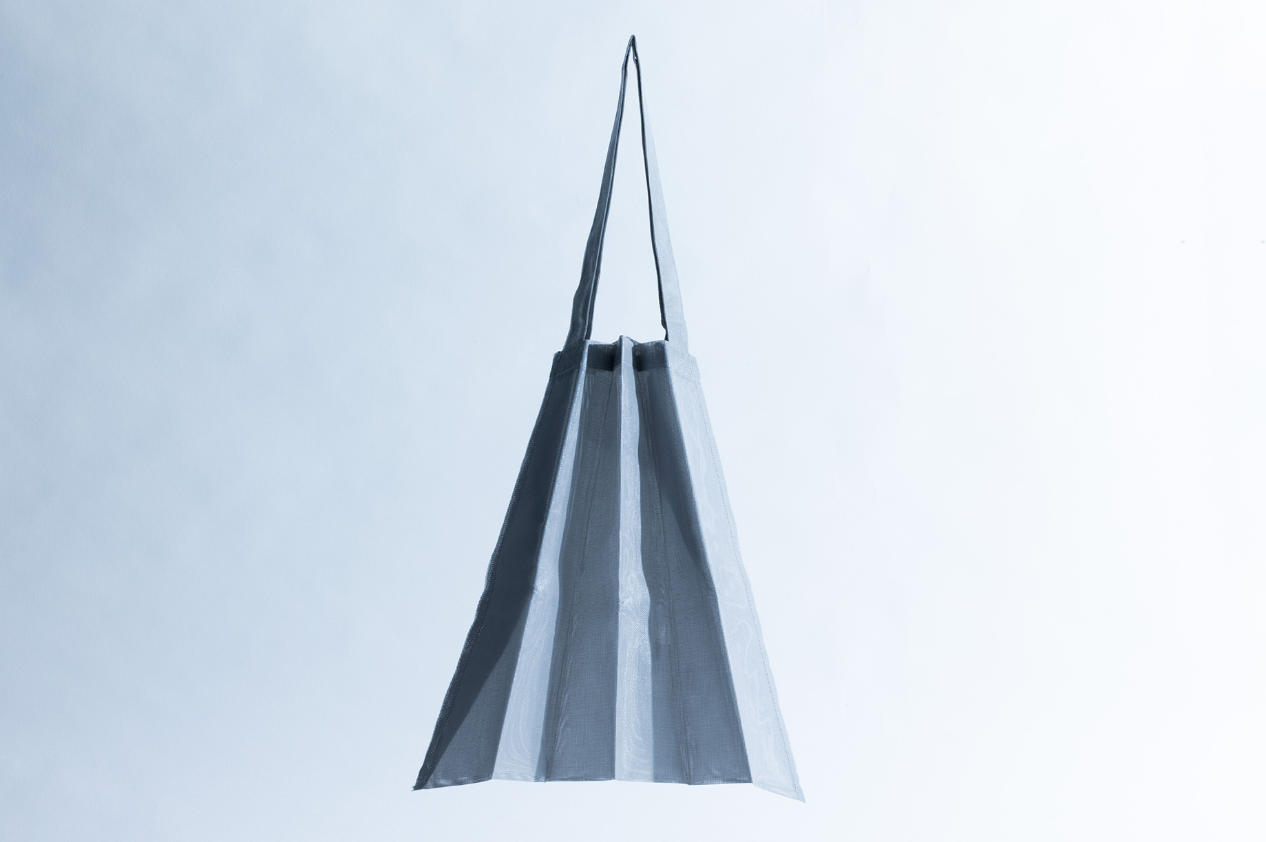 使用建築施工現場常見防止粉塵飛散的布料,製成扇形的托特包,並加上摺痕,可將包包折起收納,既美觀又實用,有灰、白兩色可選。