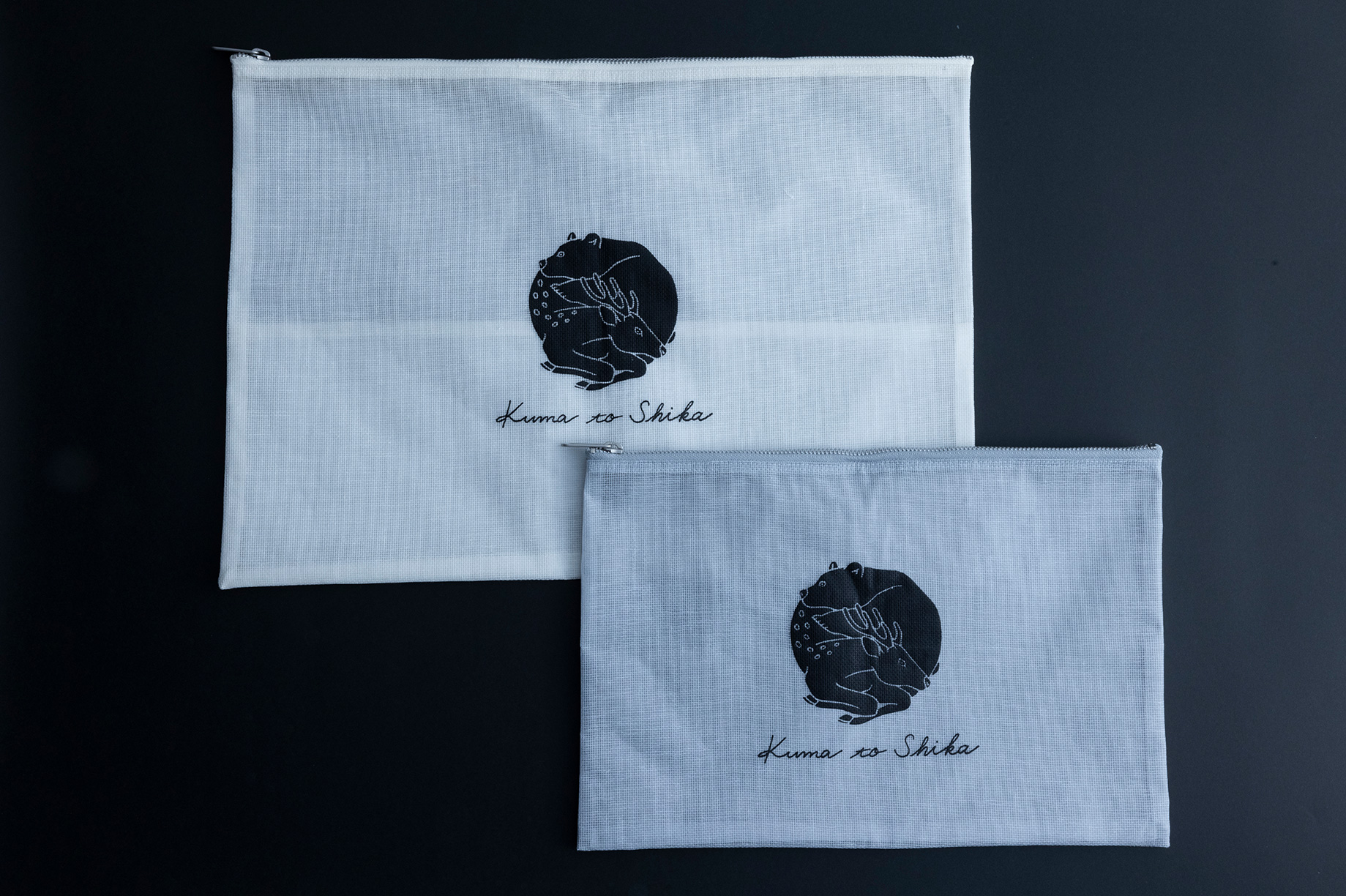 建築施工現場常見防止粉塵飛散的布料,再加上奈良特產、常用於蚊帳的織物「KAYA織(かや織)」製成的收納小包,中央印有「Kuma to Shika」的LOGO圖案,風格簡約。