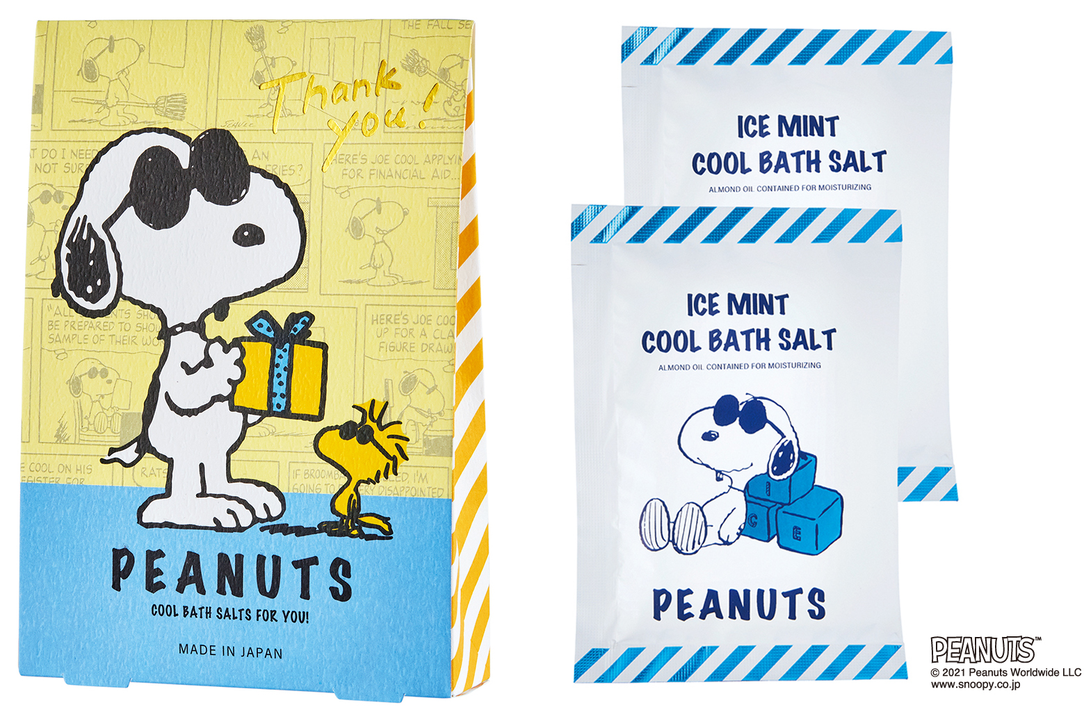 自己享受了沁涼的泡湯時光,當然也別忘了與親朋好友分享!本次也推出了夏季慰問禮盒組,2個冰涼入浴劑搭配寫上感謝字樣及送禮使送禮史努比的插圖,可謂酷暑送禮的首選!