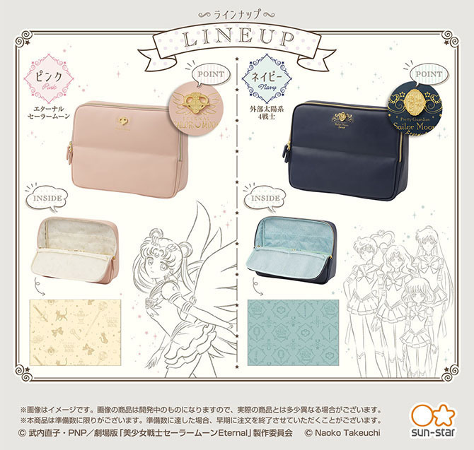 本次共推出2色,分別為粉色及海軍藍。粉色以月光仙子為概念,將劇場版中出現的道具、月光仙子相關的元素都融入內襯布料中,色調柔和,造型簡約又不失可愛,幹練成熟的女性也能輕鬆駕馭。另一款典雅海軍藍收納包,以外部太陽系四戰士為主題,外部以守護星點綴,風格簡約,內襯布料則以外部太陽系四戰士身上的元素為裝飾,帶有復古感。