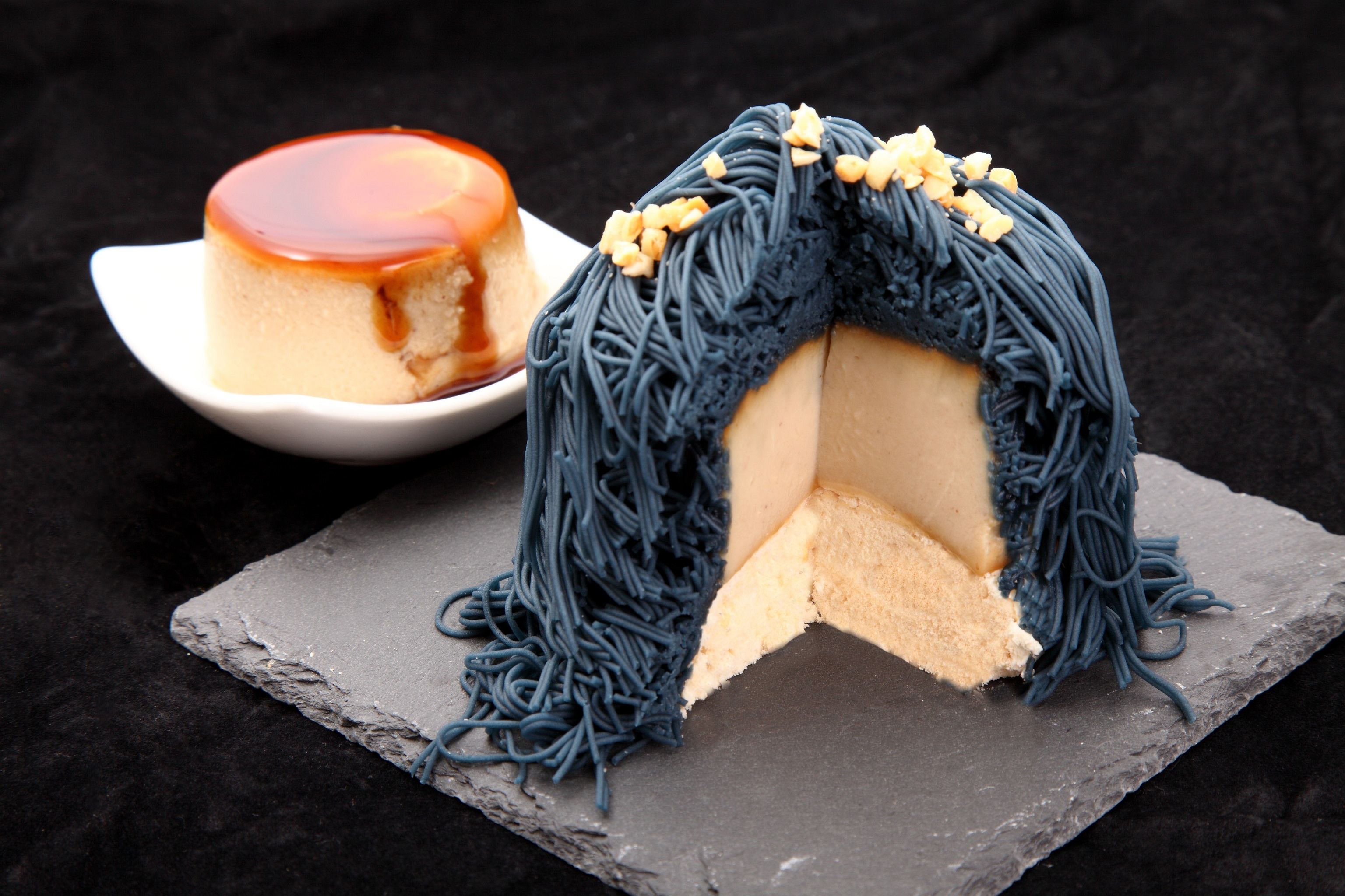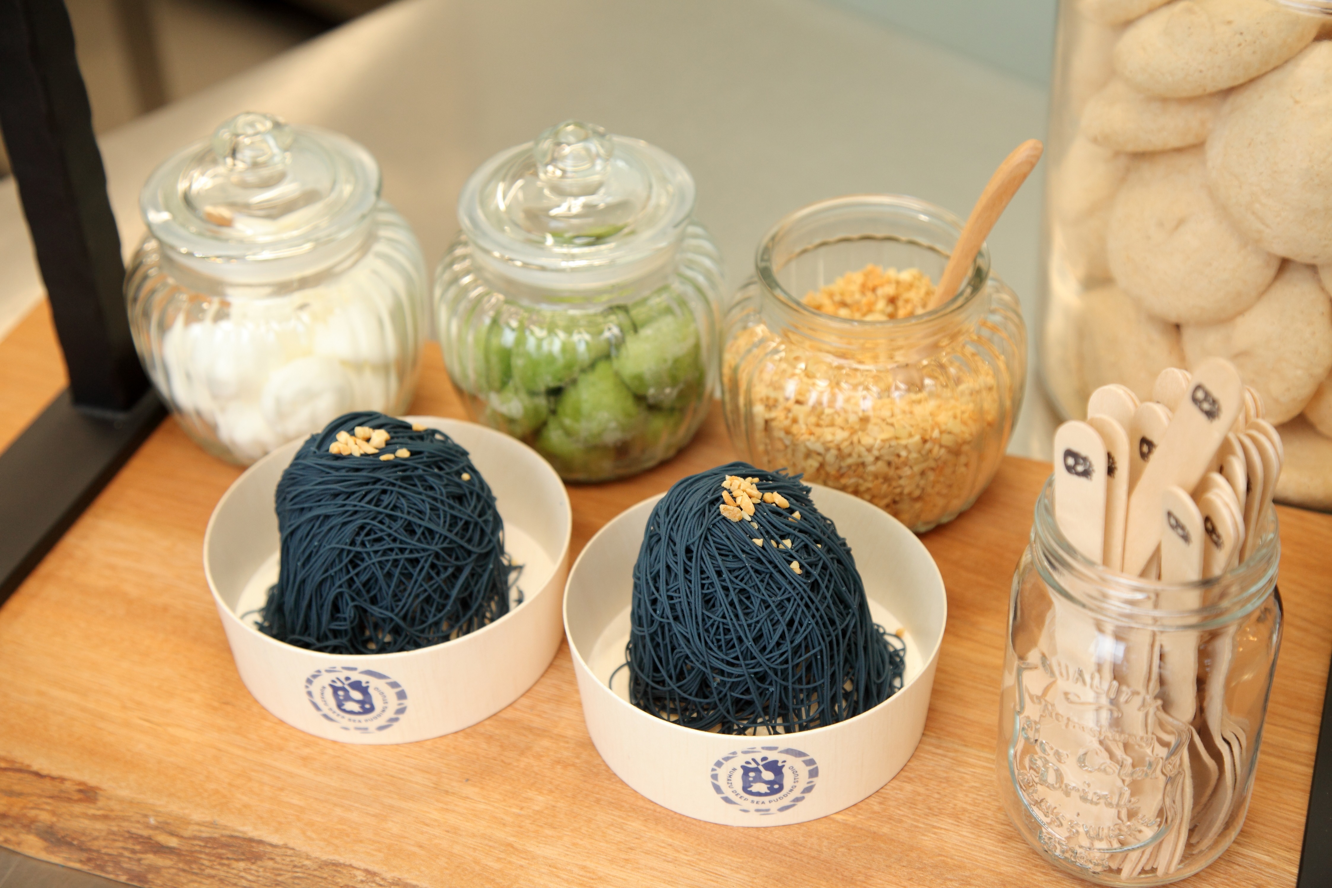 沼津深海布丁工房位在靜岡沼津港,從2018年7月開幕以來,布丁一天可以賣出至少2千個以上,一直以來都是當地的招牌名店。最近店家在改裝以後重新開幕,不只裝潢改頭換面,更研發了全新的網美甜點「深海蒙布朗」。深海蒙布朗的研發理念來自靜岡駿河灣--日本第一深的海灣。從深藍色的絲狀奶油,可以看出「海流」感,同時,也不禁令人想到克蘇魯神話中各式各樣長著觸手的「神」,不只如此,也有些類似寶可夢的蔓藤怪和芝麻街的餅乾怪!神秘的顏色令人對於口感不禁感到好奇。