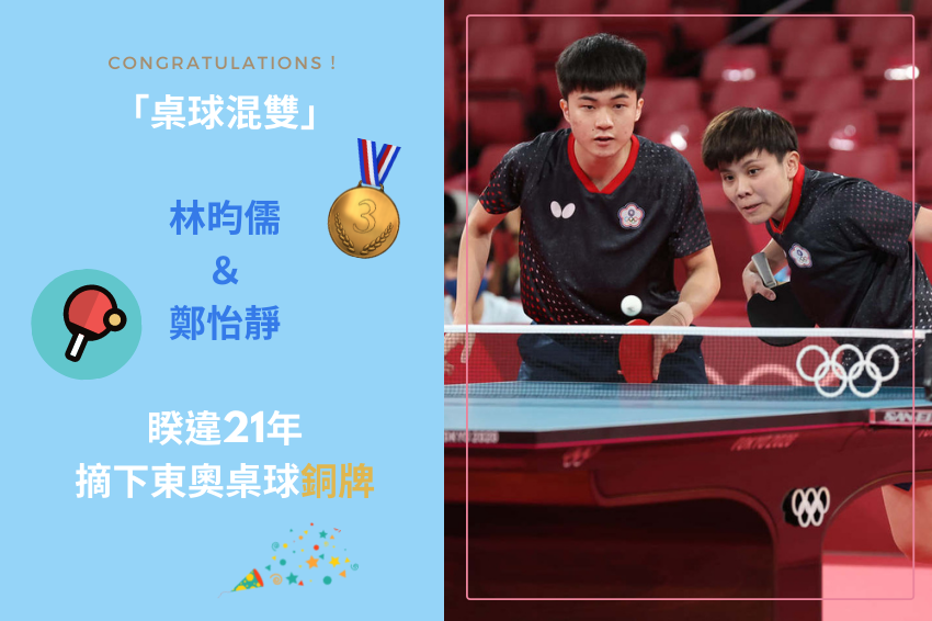 中華隊捷報四度傳來!我國桌球「黃金混雙」的林昀儒和鄭怡靜,出賽以來被國人寄予奪牌厚望,兩位選手也一路過關斬進闖入4強賽,可惜7月25日以1:4成績敗給日本隊,與金牌戰擦身而過,但7月26日晚間以直落4的成績擊敗法國組合袁嘉楠與勒班森(Emmanuel Lebesson),光榮獲得銅牌,讓台灣從2000年雪梨奧運之後,睽違21年再度得到桌球項目的獎牌,也讓中華隊目前累積至2銀2銅。