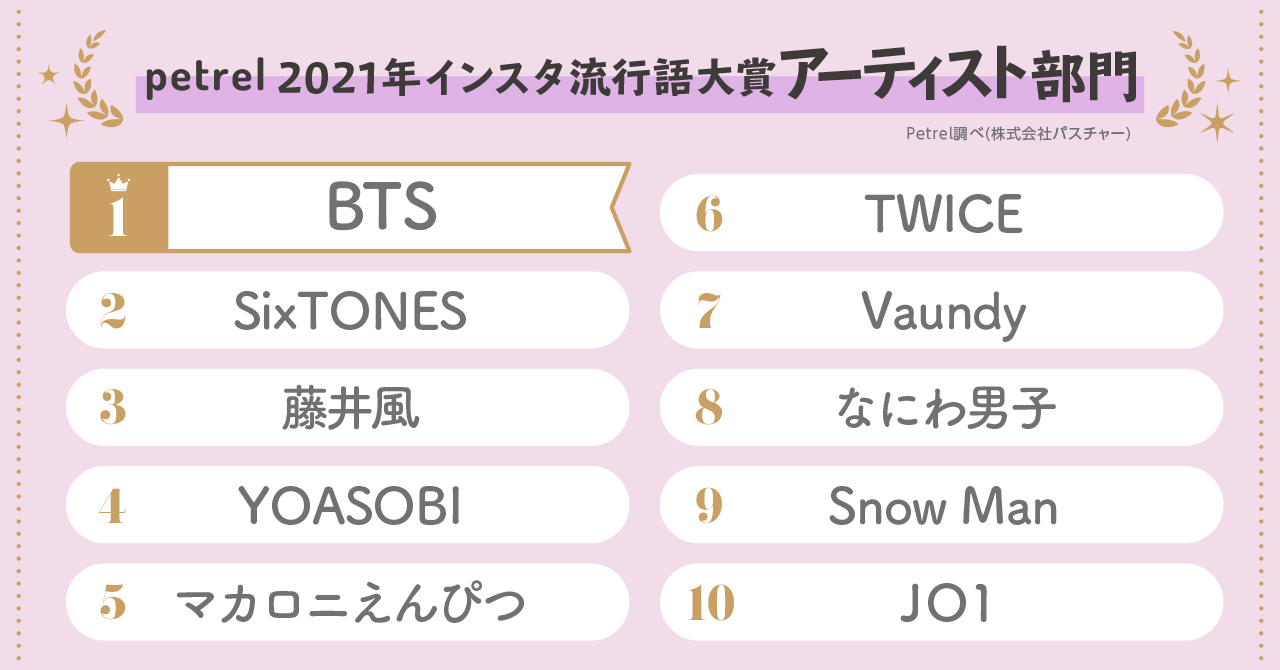 在藝人部門只拿下第7名的BTS到了歌手部門一躍成為第1名。以「夜に駆ける」(向夜晚奔馳而去)這首歌一舉爆紅的團體「YOASOBI」則位居第4名。子瑜所屬的團體「Twice」則排名第6。第11名~第20名分別是Johnny's West、嵐、Da-iCE、back number、yama、SEVENTEEN、クリープハイプ(creephyp)、TOMORROW X TOGETHER、ENHYPEN和TREASURE。