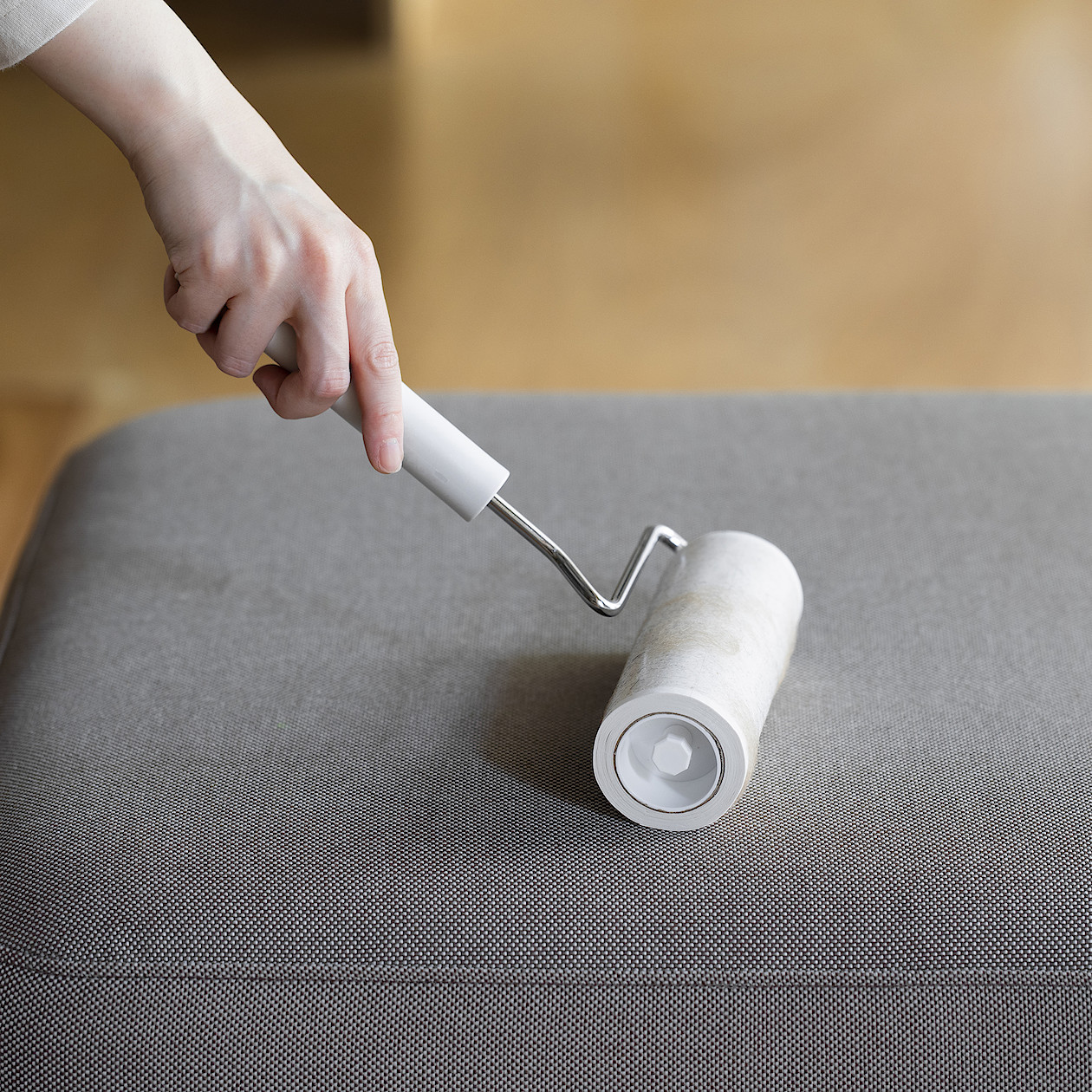 整理地毯、床鋪及衣物等布製品時,地毯清潔滾輪可輕鬆黏除棉絮及毛髮,收納時為便利的獨立式,可由保護盒的兩側收納。
