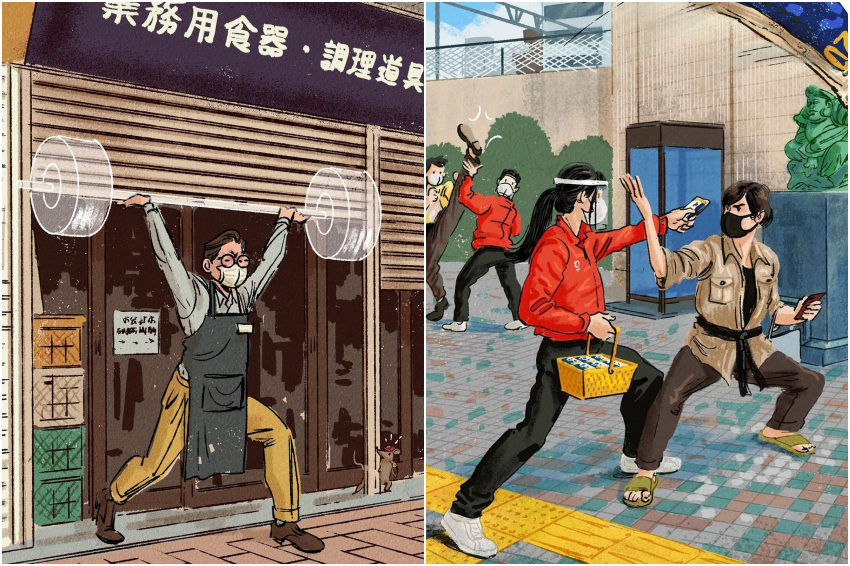 ▲地方媽媽騎車帶著孩子準備到超市搶限時特惠品的樣子,就如同自行車比賽的選手一樣銳不可擋!(左)而東京在緊急狀態期間,餐廳都被禁止提供酒類,所以不少民眾只能從便利店買酒精飲料來乾一杯,對Adrian Hogan來說這幕就像接力賽的運動員一樣。(右)圖片授權/IG@adehogan