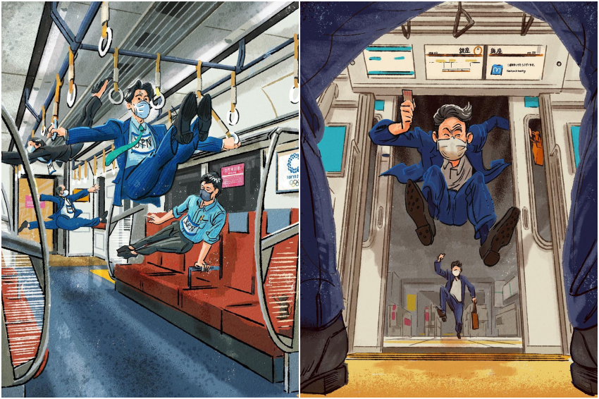 ▲電車上的吊環和扶手,全都變成競技體操十項全能的競賽道具啦!(左)還有衝進車廂的上班族是不是很像跳遠選手呢?(右)圖片授權/IG@adehogan