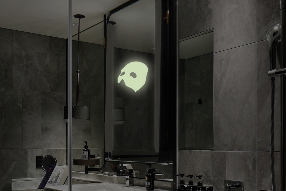 更特別的是浴室鏡子的小裝置。只要把燈關掉,房間中的半身鏡就會浮現魅影的假面,這對於心臟比較小顆的人來說,可能需要適應一下。如果會怕,不妨把目光移向窗外,客房外面就是東京的百萬夜景,值得一看。