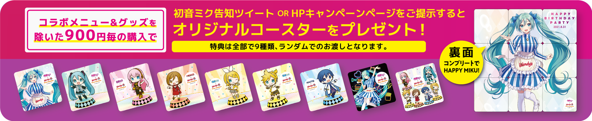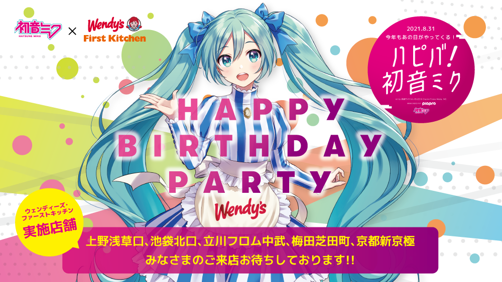 相信只要是粉絲都知道,初音未來的生日就在8月31日。為了替初音慶生,溫蒂漢堡特地舉辦了名為「ハピバ初音ミク HAPPY BIRTHDAY PARTY」的活動。粉絲可以到「池袋北口店、上野淺草口店、立川From中武店、梅田芝田町店、京都新京極店」朝聖,享用紀念餐點、入手週邊。