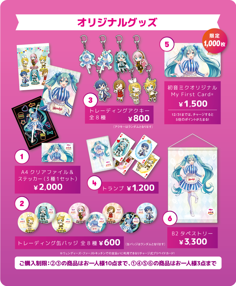 紀念餐點共分為2彈,第1彈從8月10日開始,限定1,000份,附特別醬料。餐點品名是「初音未來的夏日冰淇淋漂浮飲+初音未來壓克力立牌」,價格2,500日幣。飲料裡面包含粉色葡萄柚肉和椰果,口味清爽,消暑又解渴。壓克力立牌尺寸約10×3×18公分;第二彈從8月23日開始,一樣限定1,000份,餐點品名是「初音未來的肉肉漢堡+初音布偶」,價格4,800日幣。漢堡的肉共有3層,週邊則是尺寸約10×7.5×16公分的初音布偶。所有餐點一人最多點3份。